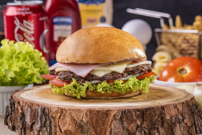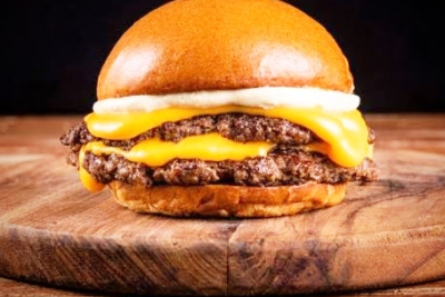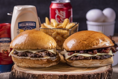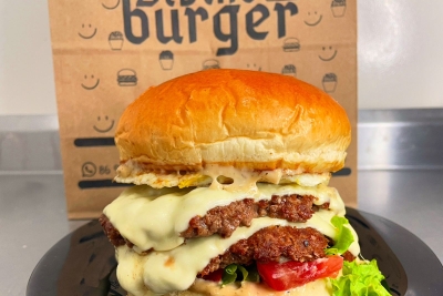 2 Blend bovino de 90 gramas, mussarela derretida sobre as 2 carnes, ovo, alface, tomate em cubos, pão de leite, maionese da casa.