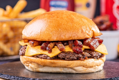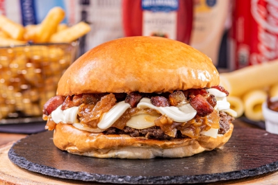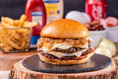Blend bovino de 90g, queijo cheddar derretido sobre a carne, Bacon em cubos, cebola caramelizada, pão de leite, maionese da casa.