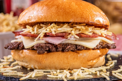 Blend bovino de 90g, mussarela derretida sobre a carne, calabresa, batata palha, pão de leite, maionese da casa.