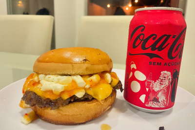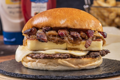 Blend bovino de 90 g, mussarela derretida sobre a carne, 100 g de queijo coalho assado, Bacon em cubos, cebola caramelizada, pão de leite, maionese da casa.