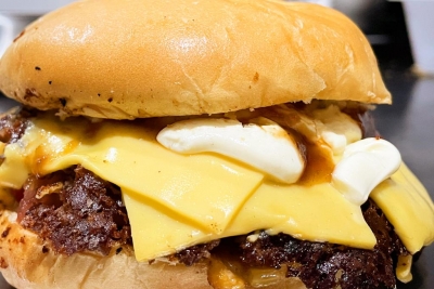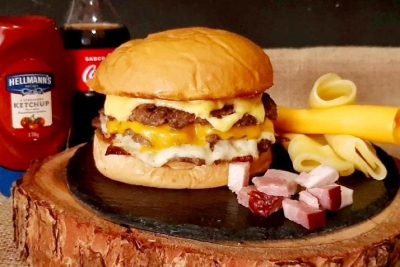 2 blend bovino de 90 g, queijo prato derretido nas duas carnes, molho barbecue, pão de leite, maionese da casa.