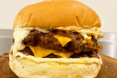 2 Blend bovino de 100g, queijo cheddar derretido sobre as carne, creamcheese, cebola caramelizada, Bacon em cubos, pão de leite, maionese da casa.